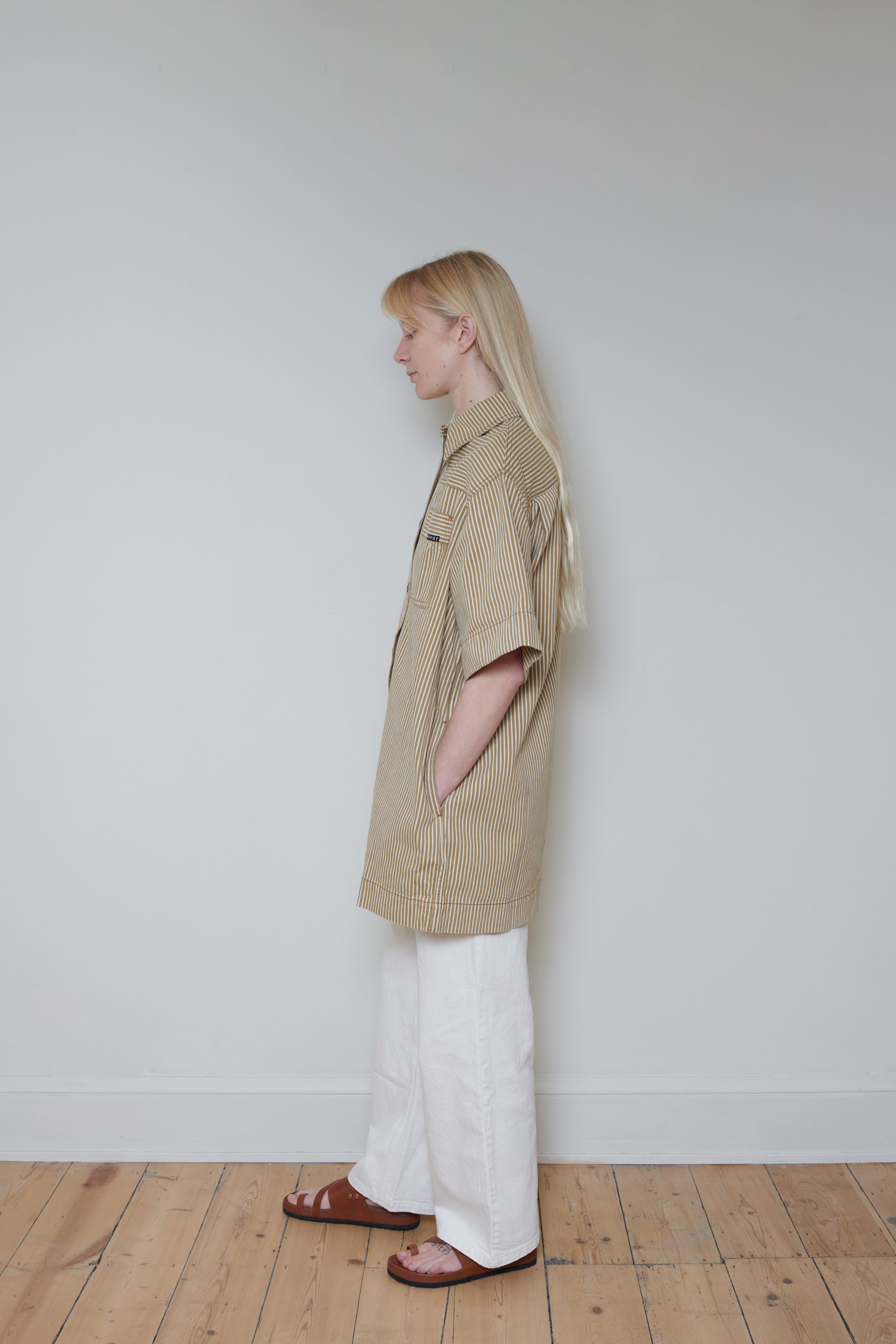 - Short, straight, shirt style- Short, wide sleeves- Shirt collar- Front button placket- One front patch pocket- "Sœur" and "workwear" woven label