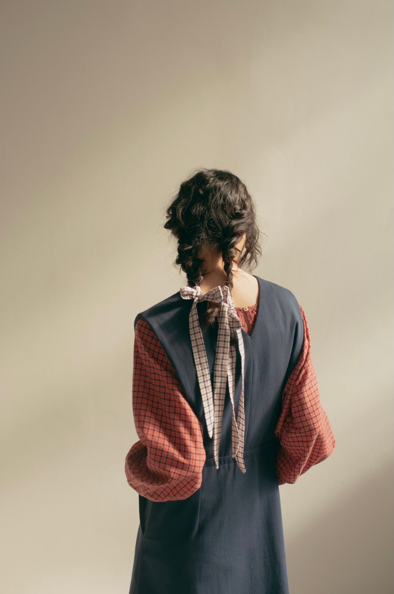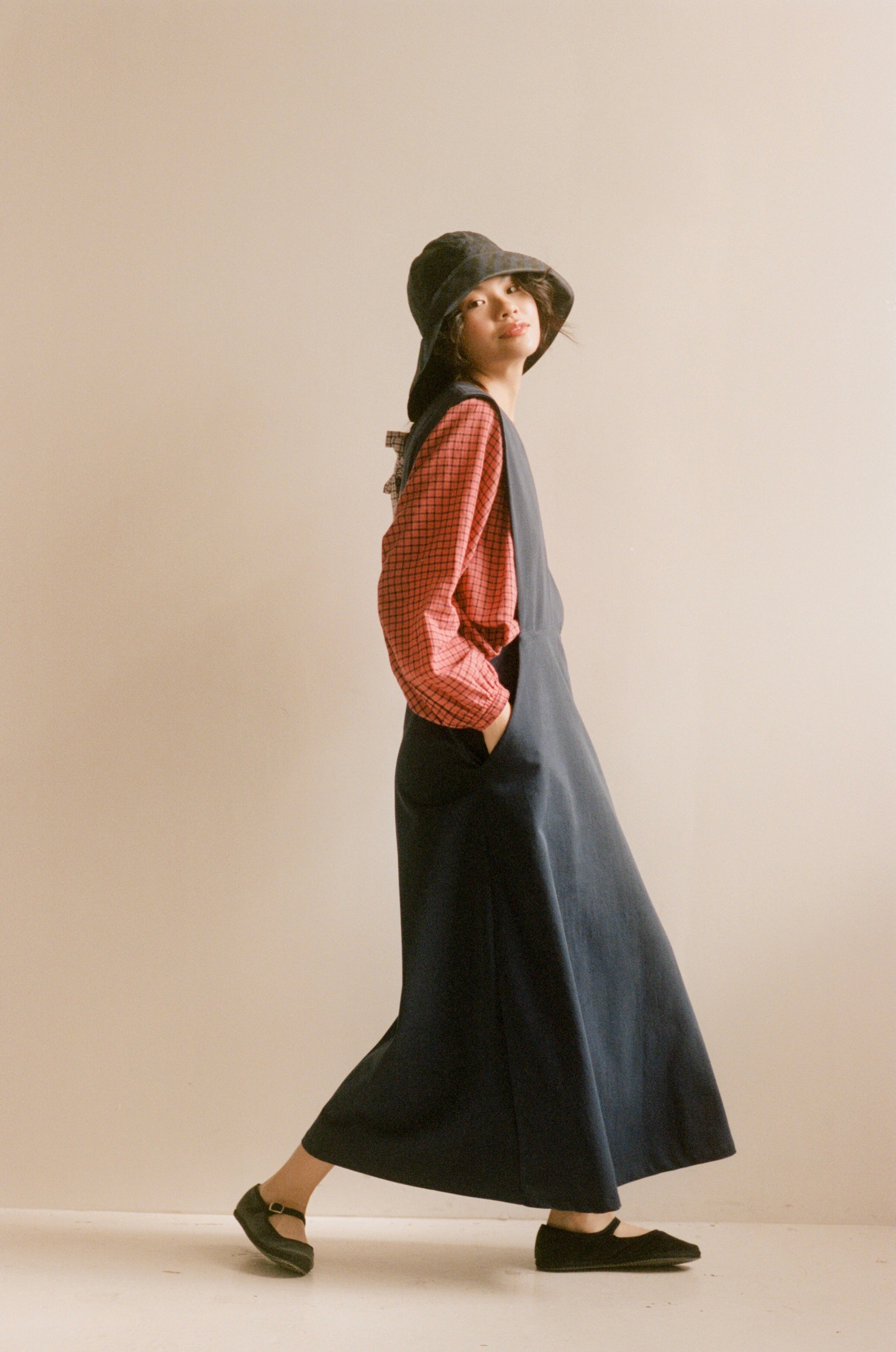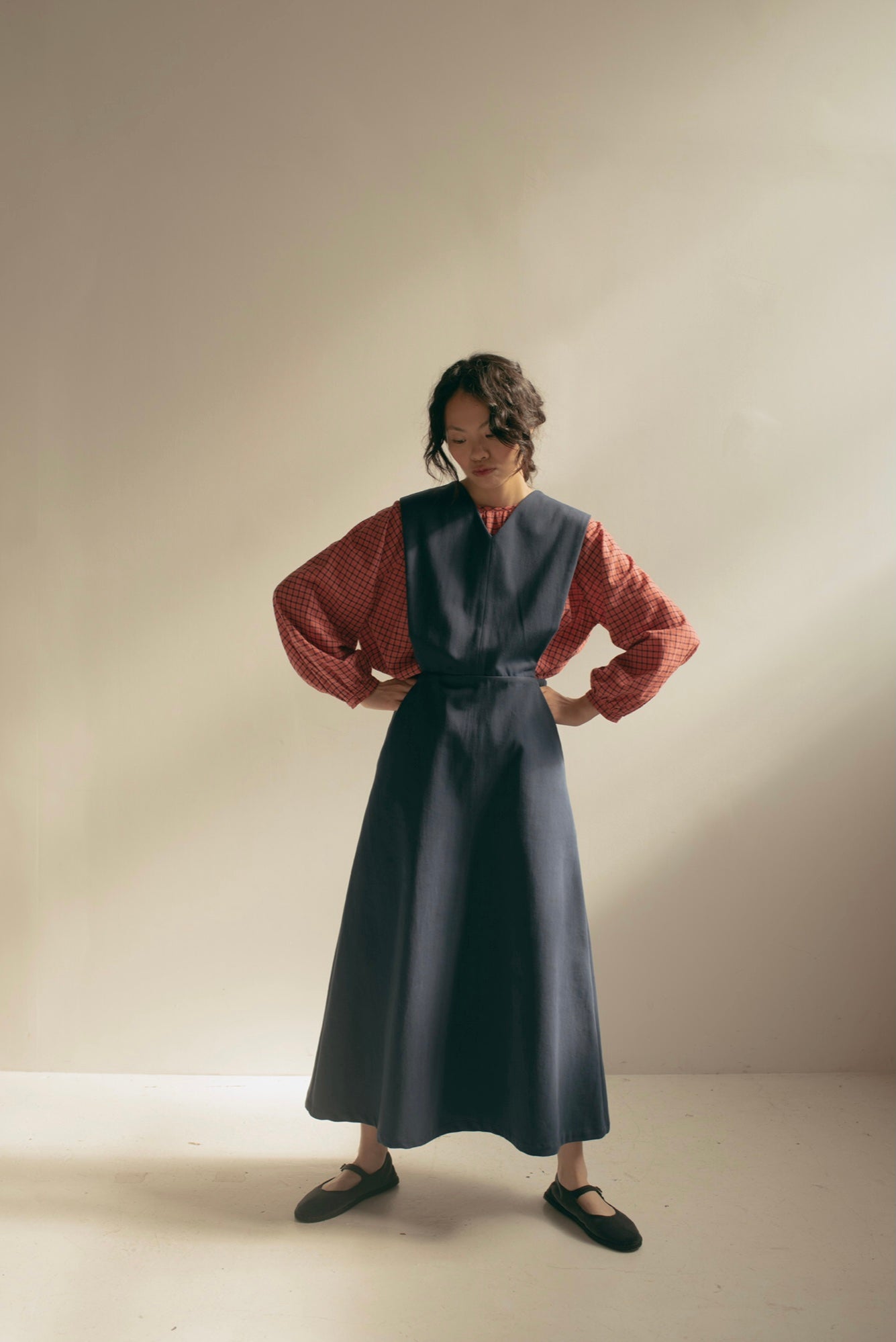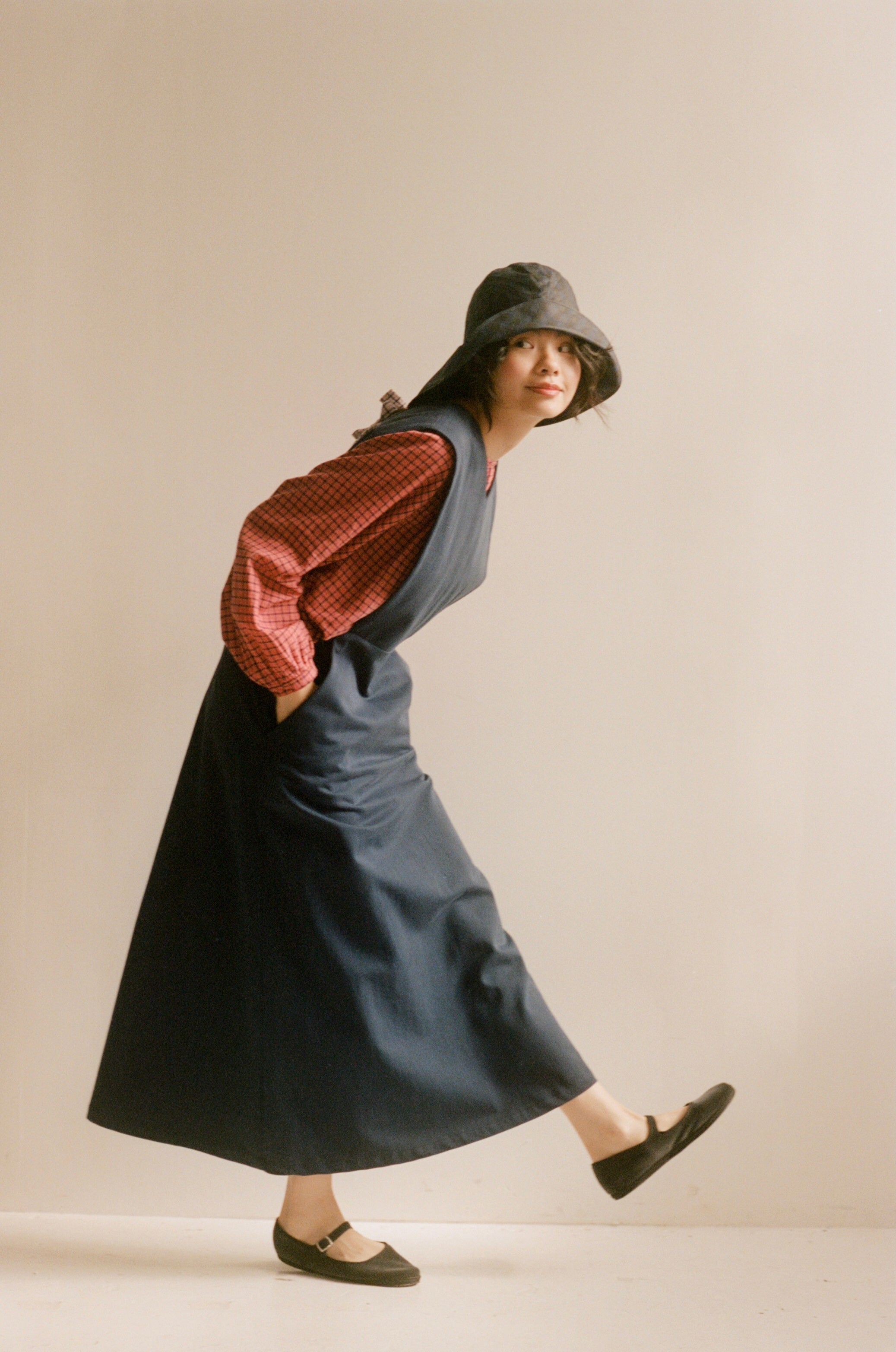 British made blue 8oz soft cotton drill pinafore dress handmade in Brighton by Zoë Ward Clothing